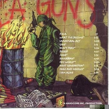 2. So OK then, tell us how you got involved in doing promotional art and CD covers for such bands as "LA Guns" ? Well the "L.A. Guns" gig was kind of a fluke. I'd always been known as "thee" local artist to go to for any band logo designs or other rock'n roll type of art. So as luck should have it, I happened to be late on delivering some art to a local bar owner in 1994. It jus so happened that "L.A. Guns" was setting up stage for a show that night and were waiting to do a sound check. As i was showing the owner of the bar my finished designs, Tracii Guns and Johnny Crypt began helping themselves to my portfolio. (to tell ya the truth, I had no idea LA Guns was there that night and was kinda flattered by these two tattooed strangers oo-ing and ah-ing at my artwork)... Thats when Tracii asked if Id be interested in roughing up some sketches for there upcoming release called "American Hardcore". Two monthes later they bought ALL the art and roughs and used two different covers on the the ONE CD. |